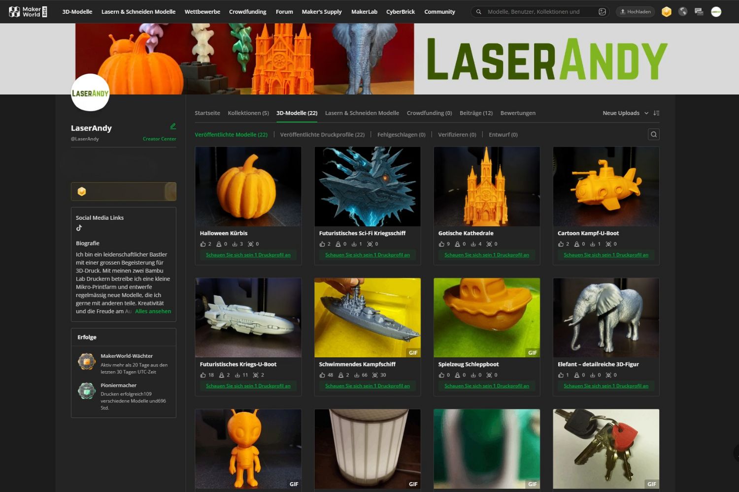Auf MakerWorld findet ihr 3D-Modelle, die ich unter meinem Namen LaserAndy hochlade. Dort könnt ihr die Modelle kostenlos herunterladen und selbst ausdrucken. MakerWorld ist eine Plattform, auf der Designerinnen und Designer ihre kreativen Ideen mit der Community teilen – perfekt für alle, die gerne selbst drucken möchten.
